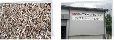 当社では森林伐採をはじめ道路工事などのさまざまな伐採業務を行っておりますが、「宇治田原バイオマスセンター」ではそれらの工事から発生する木材を有効活用した木質チップを製造しています。また木の幹、枝葉、草木などの木質廃材木も受け入れており、限りある資源である木材の再利用に取り組んでいます。