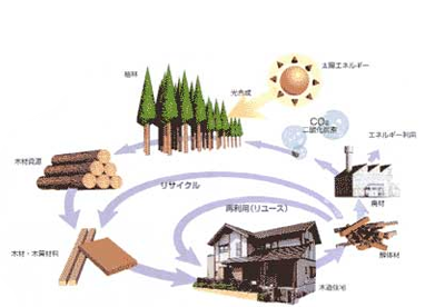 「林を構成する個々の樹木等は、光合成によって大気中の二酸化炭素の吸収・固定を行っています。森林から生産される木材をエネルギーとして燃やすと二酸化炭素を発生しますが、この二酸化炭素は、樹木の伐採後に森林が更新されれば、その成長の過程で再び樹木に吸収されることになります。