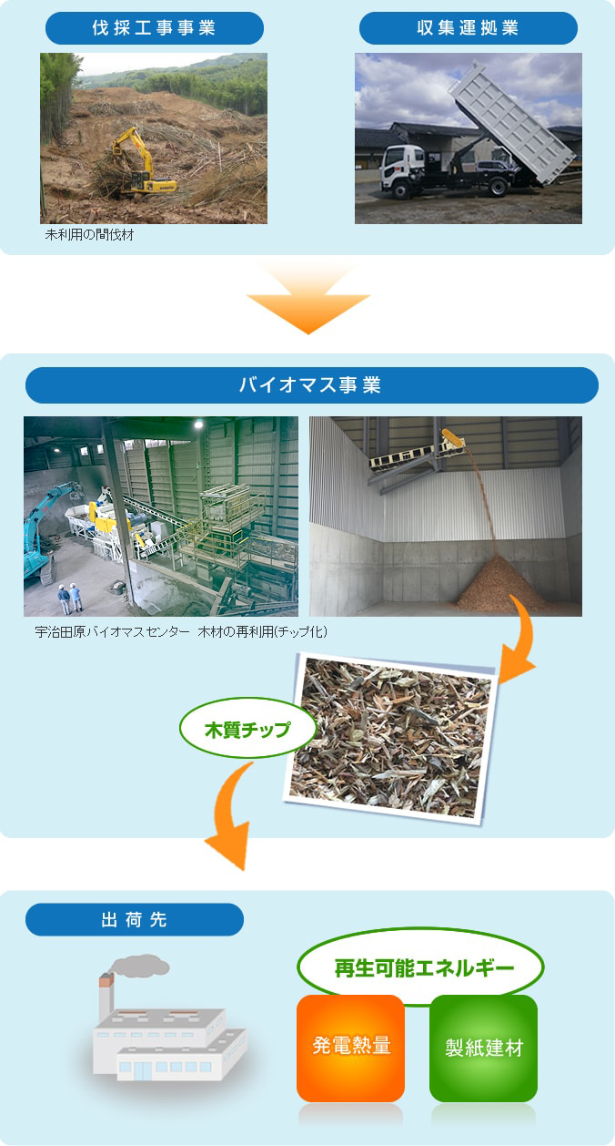 「宇治田原バイオマスセンター」ではそれらの工事から発生する木材を有効活用した木質チップを製造しています。 また木の幹、枝葉、草木などの木質廃材木も受け入れており、限りある資源である木材の再利用に取り組んでいます。